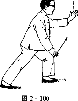 4 .腰向前挺起,左脚跟为轴,脚尖转向正东成弓步, 同时左掌向东方伸出与肩平,右掌也随身 体垂于左掌下方;眼看左掌。(图2—100)