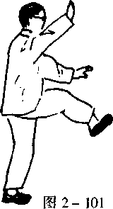 接上势,腰部挺起,右脚趁势屈膝提 起向东方蹬出,脚尖向上,右臂趁势自下 抬起,掌心向上成圆形,置于额前约一拳 高,手背对额顶,指尖向北,左掌也趁势下 按,臂成半圆形,与右脚上下相对,指尖向 南;眼看东方。(图2—101)
