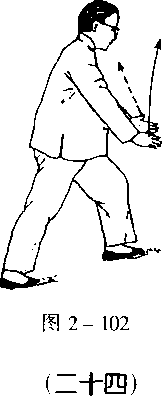 1 .接上势,右脚退后落地成左弓步;同时右掌下落与 左掌交叉成十字形置于腹前,左掌向上;重心落于左腿;眼 看东方'(图2—102)