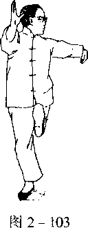 2 .重心后移,右脚跟为轴脚尖转向南方,然后两手左 右分开,同时左脚向南方挑起(脚挑起的高度以个人能力 而定,不必勉强),脚尖向上,两掌提到与肩平,左手抓成爪 形,右手变成立掌;眼看东方。(图2—103)