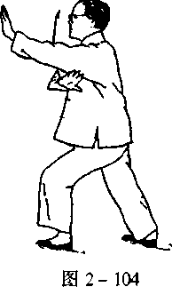 接上势,上体向右转向西方,右脚跟为轴,脚尖随腰转 向西方,左脚尖垂直,转到西方落成弓步;重心落于左腿; 同时左掌掌心向下,由右臂上方伸向正西变成立掌,腕与 肩平,右掌拢至左腋下方;眼看左掌。(图2—104)