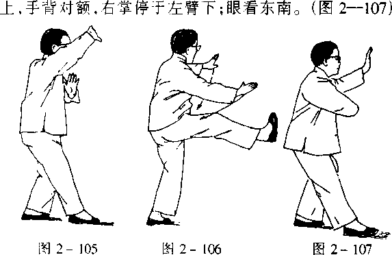 1 .腰向右转,左脚跟为轴,脚尖转向东方,重心落于 左腿成虚步;同时右掌自左腋下上翻于额上,手背对额,左 掌自前方收回拢于右肩;眼看东方,(图2—105)