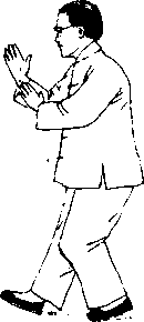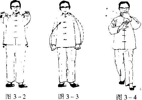 两臂垂直落到身体两侧时,两掌和指均向前翘起,不要用 力,要求架势务必做到正确。(图3—3)