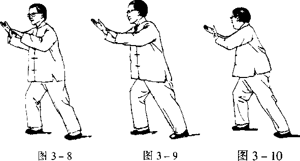 3 .身体左转,扭动腰部,两手接上势向西南角伸出, 右腿变成弓步?,身体向西南方倾斜,右手同左手一齐伸出, 掌高与肩平,两臂成半圆形,肘尖向下,眼看右掌心。(图 3—8)
