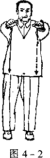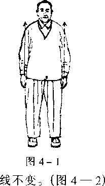 1 .面向正南,两脚平行立正,脚间距离为一横足宽。 两臂下垂,下须稍内敛,眼看前下方,与水平线呈45度 角,作好虚领顶劲.(图4—1)