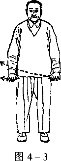 3.两肘下沉,两掌随肘徐徐下落,弧形按于两胯旁 ,手指微翘;视线不变。(图4—3)