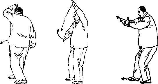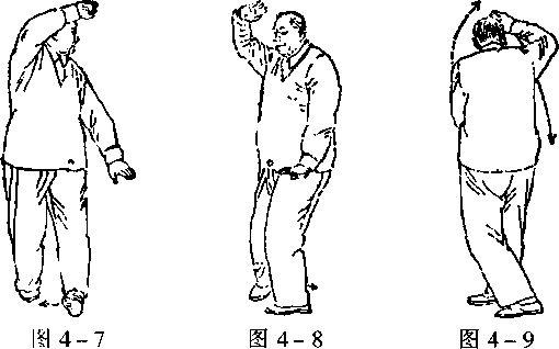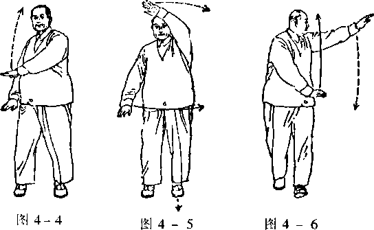 要 领:本势自动作1 ~ 8都是用腰旋转,幅度要 大,动作缓慢,注意沉肩坠肘;(图4—12)是发劲, 名为中定劲,此势非常重要,腰、掌和腿的动作要迅速 完成。