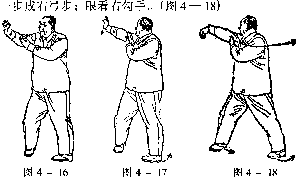 转身带动右勾手转向西南,同 时左掌离开右臂.掌心向内划向 东北,然后掌心向外转;眼看 左掌背,(图4—19)