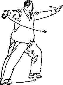 8 .上身转向正西,右手手指下垂,掌心向内拢至腹 前,左手动作和重心不变;眼看西方地面。(图4—11)
