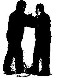 3 .甲方身后移,捋乙方左臂,腰向左转,将乙方左手 捋至左侧胯旁,坐腿成虚步。乙方乘势挤肘,右手掌贴左肘 弯处,与甲方右手背相接,同时弓前腿。(图5—67)