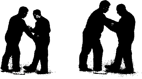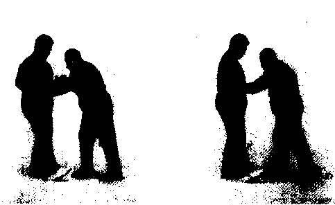 随势乙方挤肘,左手背与甲方左手背相接,捋甲方右 臂,恢复为(图5—65)姿势。如此往来不息。
