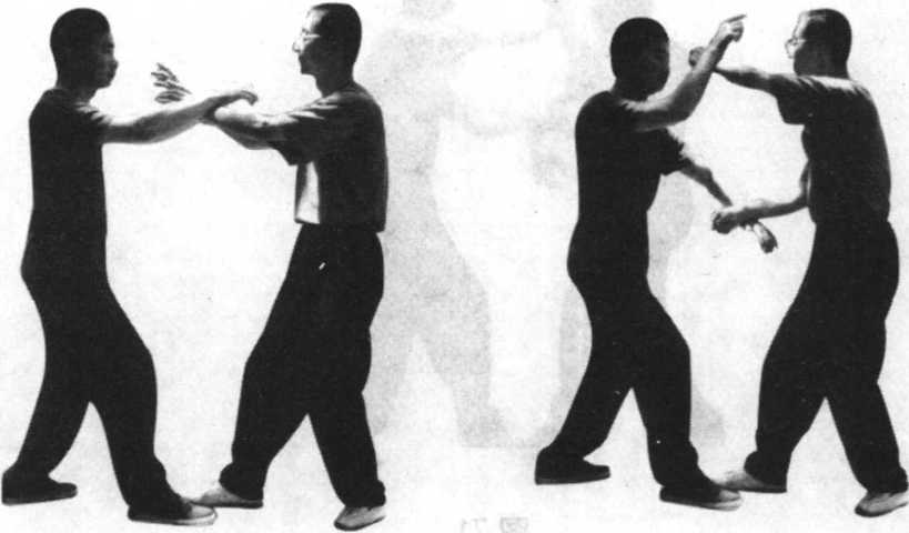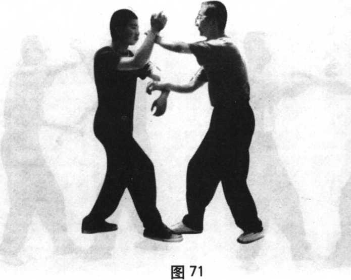 练习方法是甲乙双方彼此以两小臂相搭接(手在上为搭,手在下 为接),由自身中线部位往自身左右两外侧,由上往下缓慢地做弧形运 动,同时配合摩擦步做前进后退的练习。(图67、图68、图69、图70、 图71)