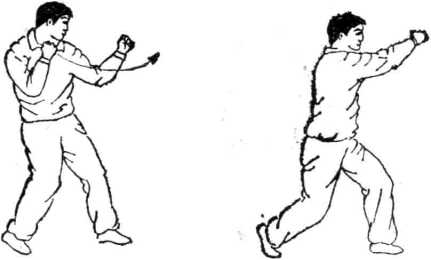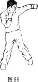 (1)左摆拳左脚向前滑步的同时左拳伸肘以眼线向对方侧面击出拳心向左拳眼向下力达拳面大小臂微屈成弧形发拳时要拧腰转偶借助腰身的力量来完成右拳护下颌(如图65、66)