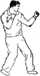 (1) 左下勾拳左势开始左拳从身体左侧向下并向右前弧线击出同时左脚蹬地腰向右转挺腹直腰大小臂弯屈约成90°,拳心向内力达拳面。右拳护下颌(如图69、70)