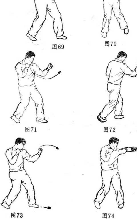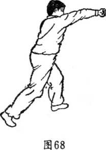 (2)右摆拳左脚向前上步同时右脚自然前移跟进并脚跟立起右手从右侧划弧向对方头部击出拳眼向下力达拳面右臂成孤形腰向左转以带肩臂内合增加攻击力量左拳收回置于下颌左侧(如图67、68)。
