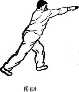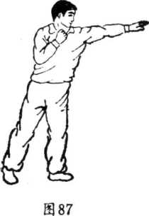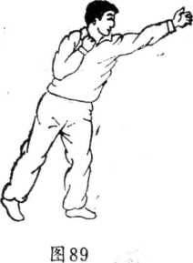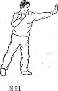 (1) 左弹掌重心前移至左腿长腰、探肩、伸肘用冷脆劲将掌抖出力达掌指背右拳护下颌(图89)0