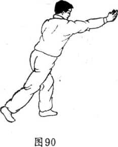 (2) 右弹掌左脚上步重心前移至左腿腰向左转探肩伸肘用冷脆劲抖腕弹出右掌力达掌指背右脚自然前移脚跟立起左拳回收护下颌左侧(如图90)0