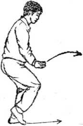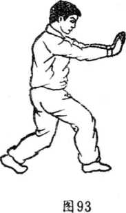 (2)双推掌左势左脚上步右脚跟到左脚内侧成丁步(或不触地)左右手变掌下按至腹前(图92)。右瓣上前一步重心前移下沉双臂在右脚落脚时同时向前下奋力推出力达掌根(图93)