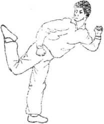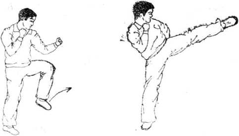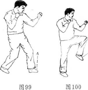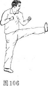 (1) 正弹腿左格斗式左腿提膝脚尖绷直右腿支撑身体左腿以大腿带动小腿向前弹出略比裆高以脚背或脚尖为着力点快踢快收上体和双臂保持不动(如图99、100、101)