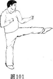 动作右脚向右前上步重心前移至右脚左腿提膝小腿外展脚尖绷直大腿带动小腿以脚背为力点从左向前横踢。右拳收回置下颌右侧左拳下格至左胯侧(如图102、103)。