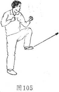 动作说明两脚自然站立左腿支撑右大腿向后抬起带动小腿屈踢脚尖绷直力达前脚掌(或脚根)(如图104)