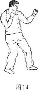 松肩坠肘含胸收下颌闭口合齿气下沉不僵不懈眼视对手蓄劲观变(如图14)