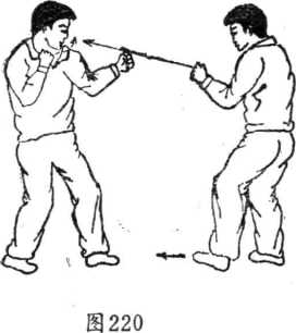 右拳变掌拍开来拳(如图220、221)。