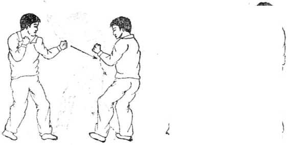 防右直拳对方以右直拳击我面部时我左拳变掌前伸接触对方右臂向右下拨压使其向我右下偏移(如图334、235)