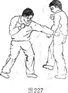对方以左直拳击我腹部时我上右步用左臂向左后下方挂开对方来拳(如图226、227)