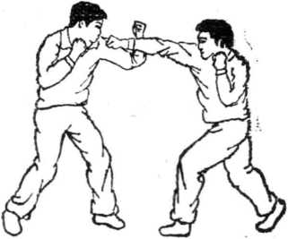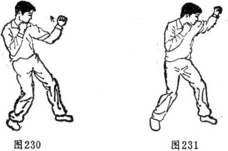 1 外挡对方以右摆拳攻我头部左侧时我左手屈臂由内向外挡住对方右臂(如图230、231)