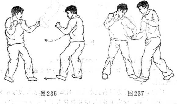 1按掌对方以右下勾拳击我腹部时我用左掌、掌心向下按压对方小臂同时收腹重心下沉(如图236237)