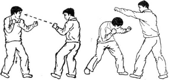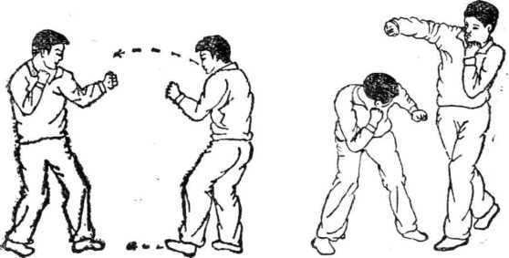 例一对方以左直拳击我面部时我迅速沉身、缩头、上体前俯闪开对方的攻击眼尽量看对方(如图282、283)