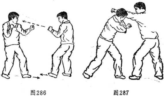 (1)左拍右闪对方以左直拳击我面部时我右手变掌向左拍击来拳头向右偏身倾右倾左脚同时上前半步重心大部移至左腿眼看前方预备反攻(如图286、287)