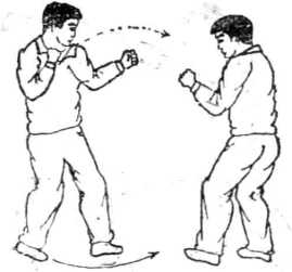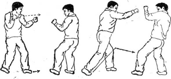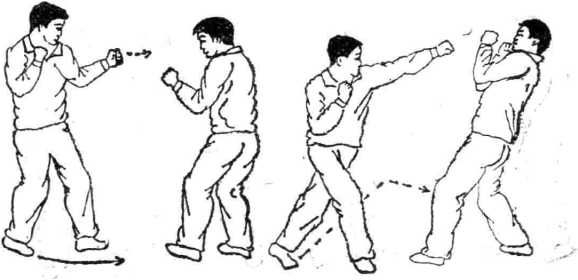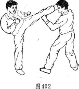 双方左势对峙时我以右直拳佯攻对方头部待对方防上时起右侧踹腿攻其左膝右腿踹完前落向右转体同时以左边腿横踢对方头部(如图399、400、401、402)。