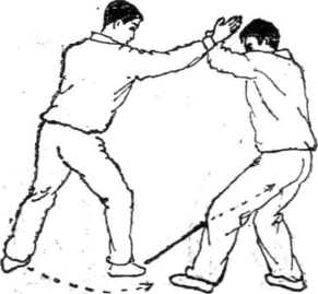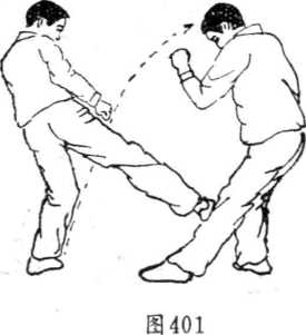 双方左势对峙时我以左直拳佯攻对方头部同时右脚上步左铲腿攻其左膝关节随后落地内扣右后转身起右腿后撩其裆目视右后方(如图406、407,408、409)。