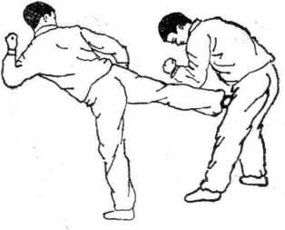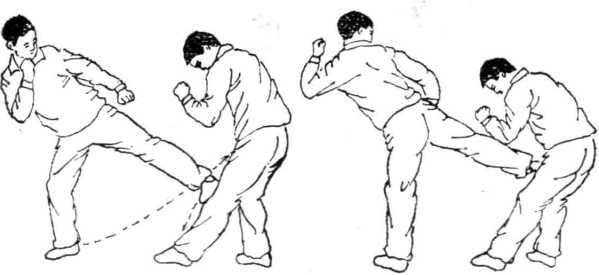 双方左势对峙时我上右步以右砍掌佯攻对方头部趁对方架臂防守时左脚从右腿后插进一步身体左转速起右后撩腿攻其裆部(如图403、404、405)。