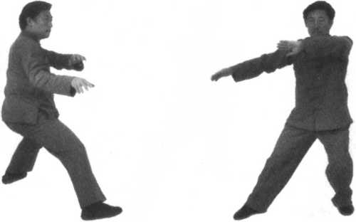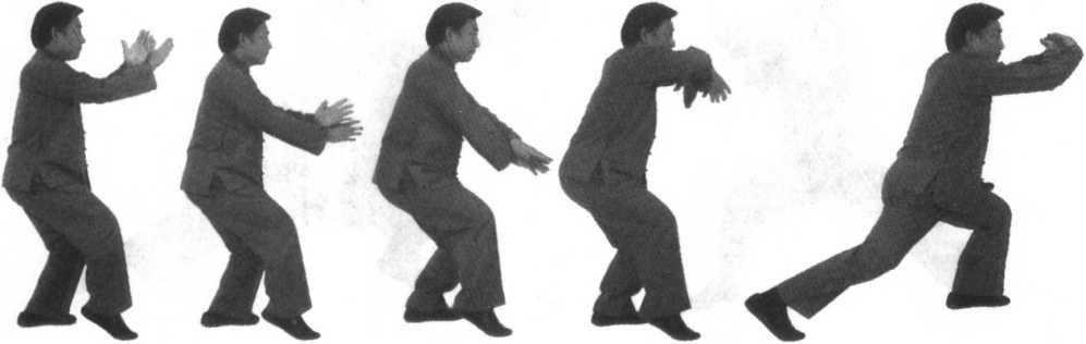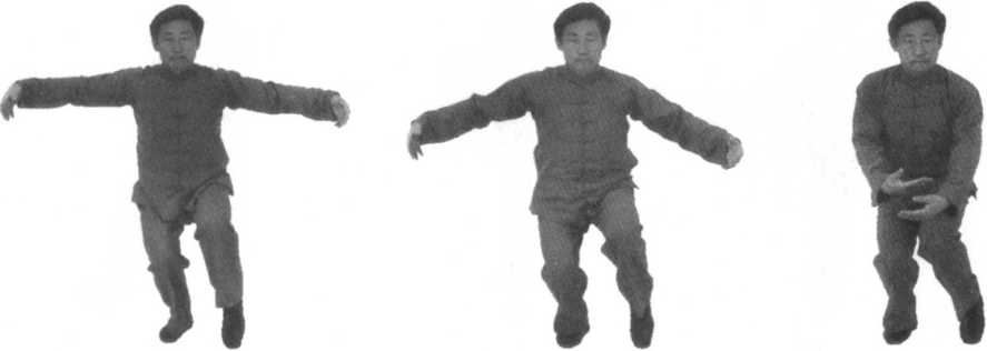 要点:在两手向下分时,腰劲塌下,两臂莫失搠劲。当两手由分转为合时,松肩松肘,后背放松,收回左足,两肘相合,两膝 相合,气归于丹田。