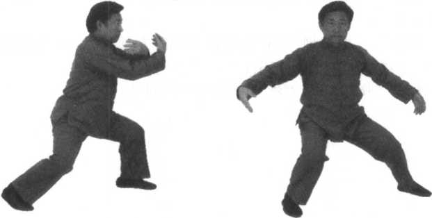口令2(图7 -670.671) 身体继续右转,提左脚向左前方开一大步,左手内旋抬至胸前,