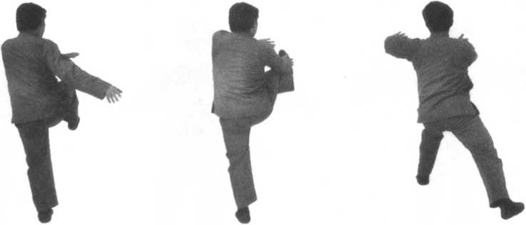 要点:重心控制在左足,左膝要与右膝合住劲,借转身的惯性迅速将右足提起。
