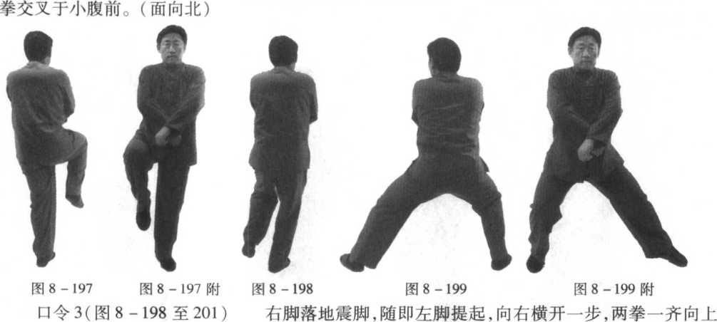 口令1(图8 -193、194、195) 身体右转,身法略下沉,右拳屈肘回收到胸前,同时左掌变拳外旋
