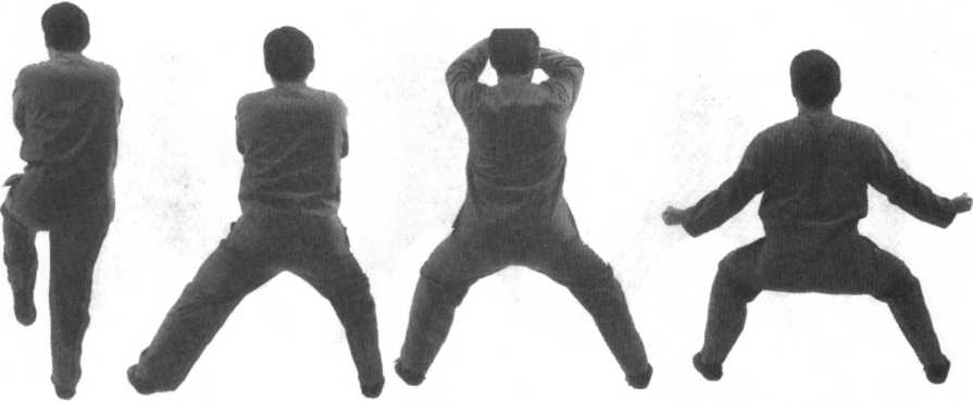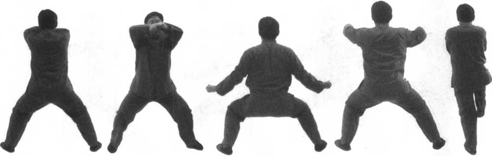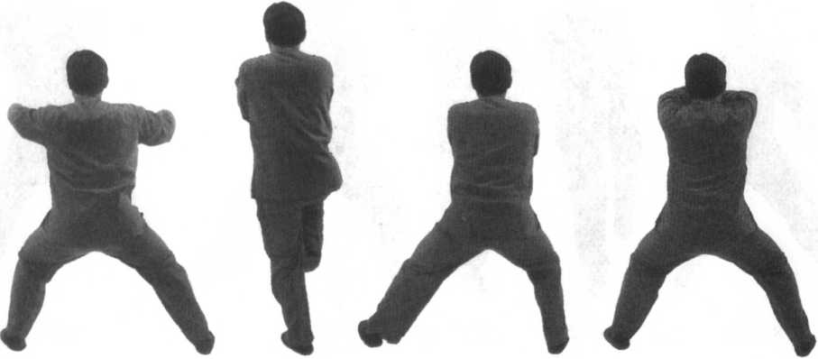 外旋经面前向左右两侧下方砸击,置于两膝前上方,拳心向上。重心配合着向左移,身体向下蹲。
