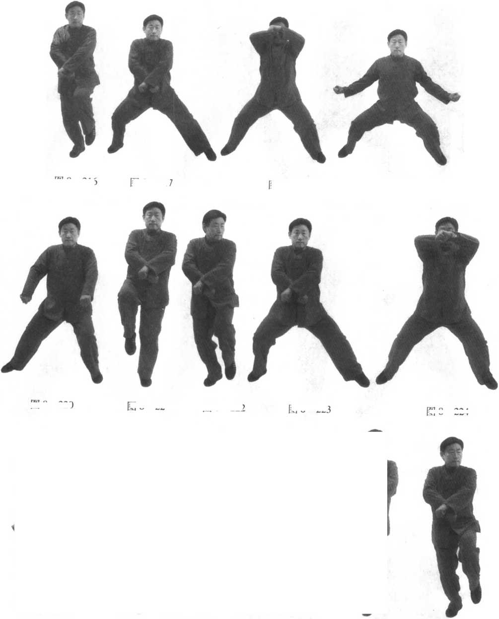 口令5(图8-213至231) 右脚提起,左脚里扣,身体向右转体180度,再连续向左移动