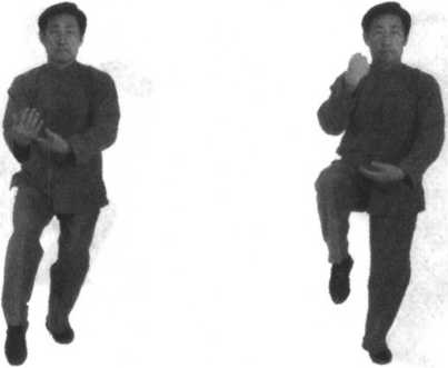 重心下沉,同时左手坐腕,右手内旋掌心向上,双手随重心下沉至腹 右膝提起与腹平,脚尖向下,同时左手掌心向上于腹前,右手握拳,屈