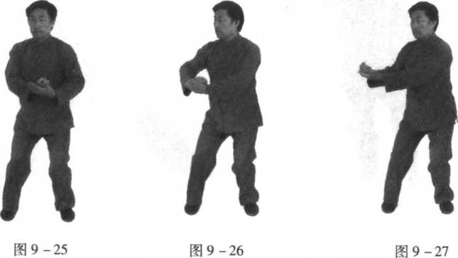 身体微右转,重心偏左,同时左手外旋右手内旋,后双手内旋运身体微右转,重心偏左,同时左手外旋右手内旋,后双手内旋运口令 1(图 9 -25、26、27) 至右前方。