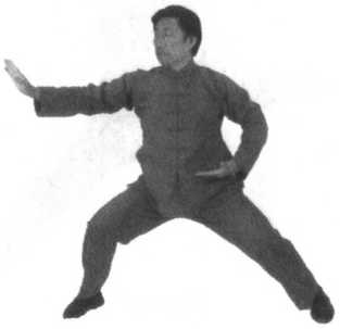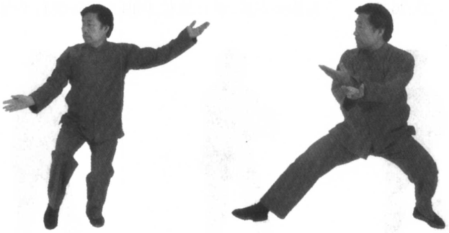 2.此势充分表现了上下(手与足)相随的关系。划一个圈转到上拥时,手为虚,手下的脚就变为实,反之则为虚。 这也是求得内劲中正的关键。(但提腿独立者除外。一足站立,为了保持中正,平衡重心,站立的独足是实,实