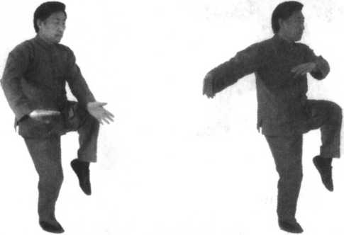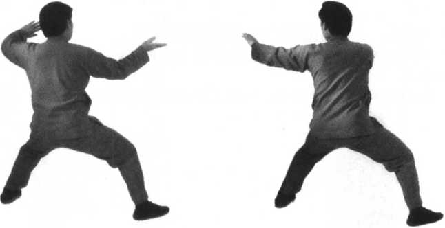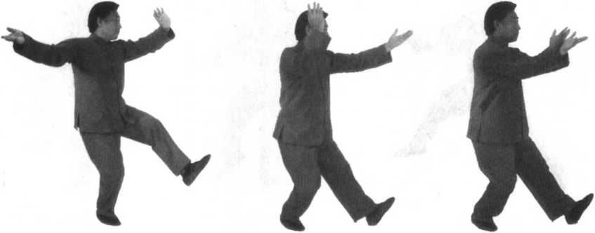 口令2(图9-118J19J20) 左脚向前迈步,脚跟落地,脚尖外摆,重心在右,同时两掌里