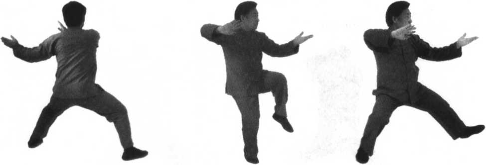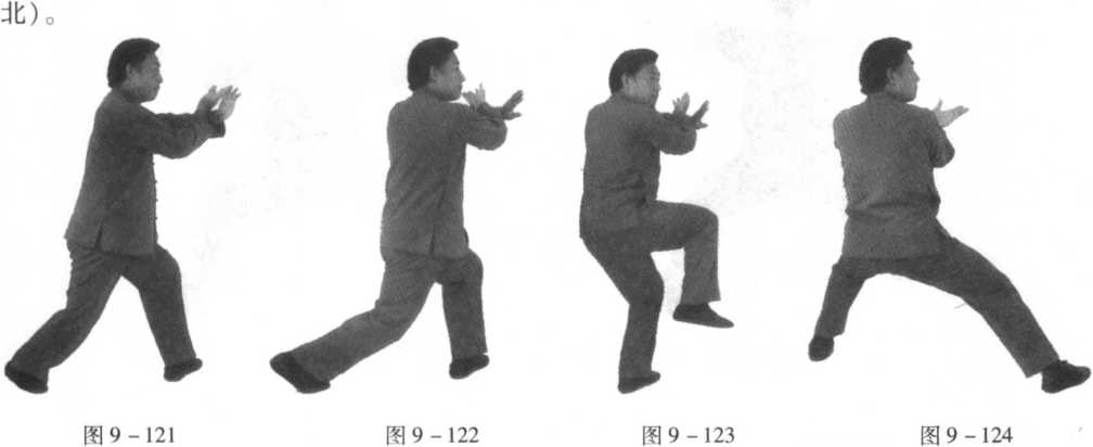 口令3(图9-121至124) 重心移至左腿,右腿提起,向右后方45度开一大步(面向东