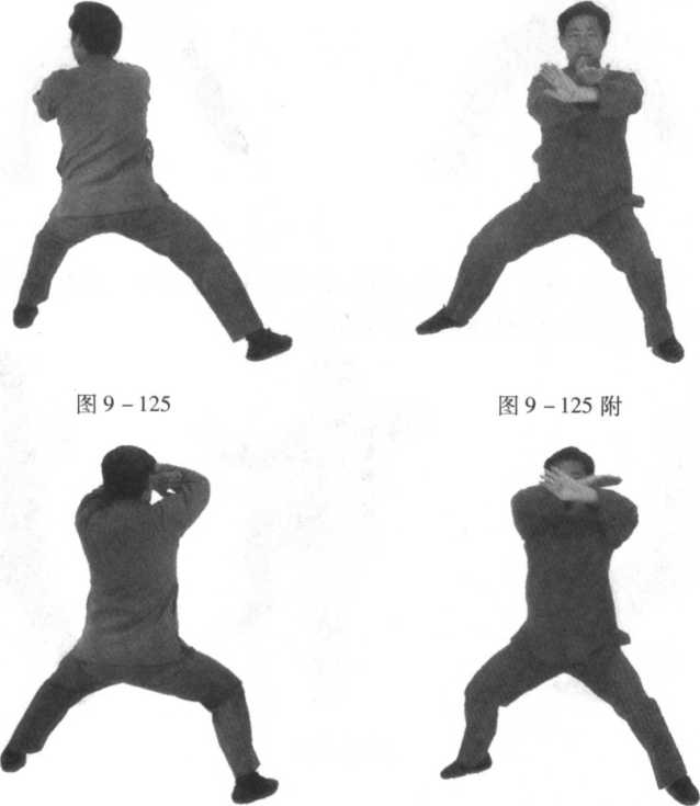 口令4(图9-125、126、127) 身体左转,重心右移,两手外旋,两臂向上划弧分至身体两