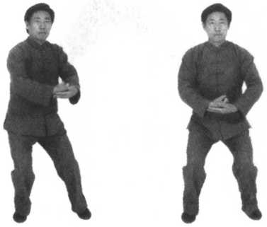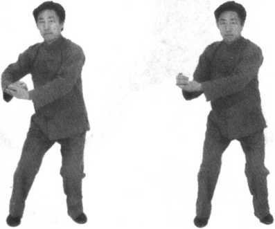身体微右转,重心偏左,同时左手外旋右手内旋,后双手内