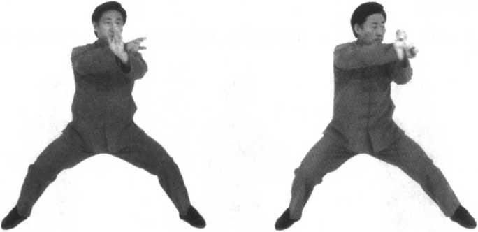 口令1(图9 -208.209) 身体稍右转,重心左移,同时两拳左上右下,移至体前,拳眼向